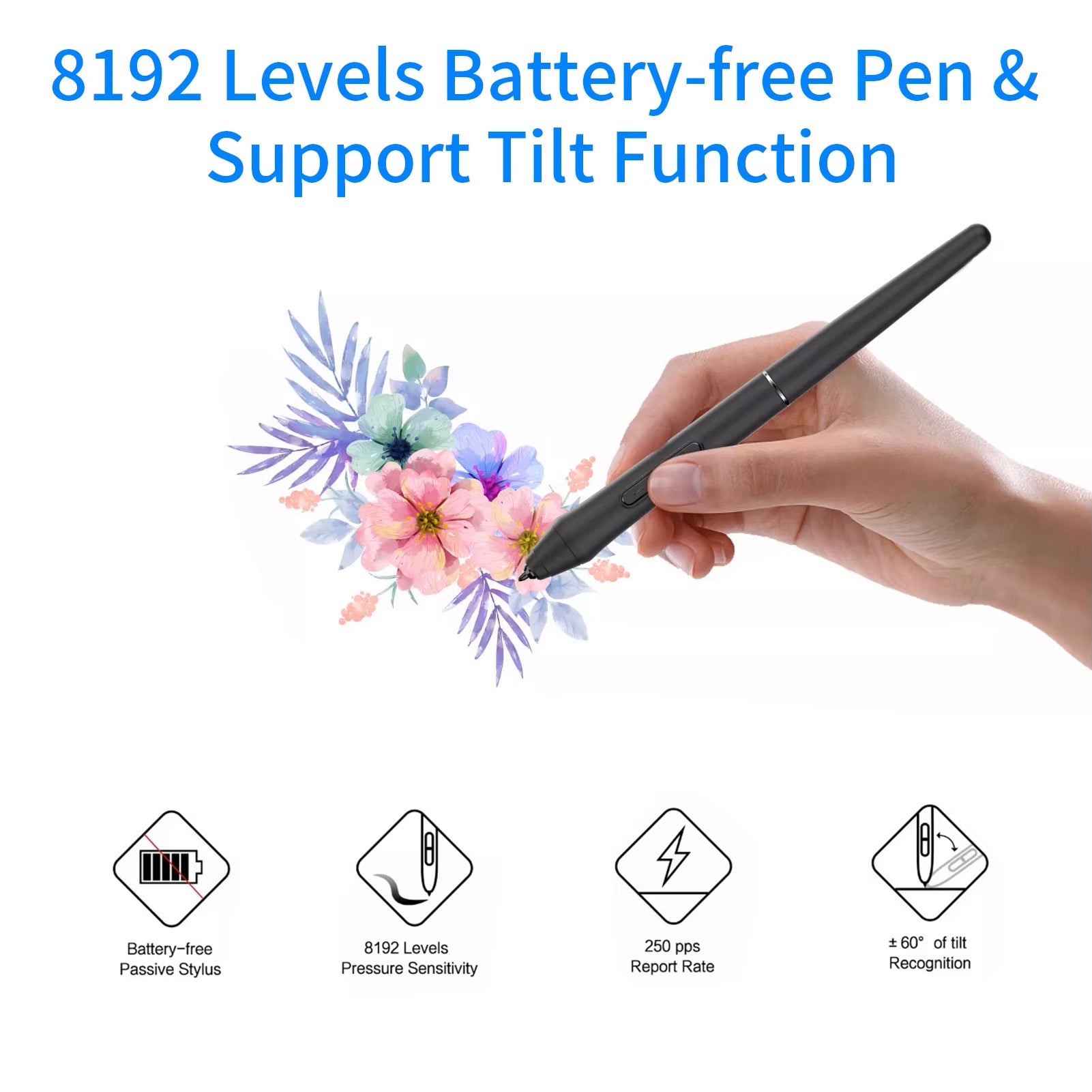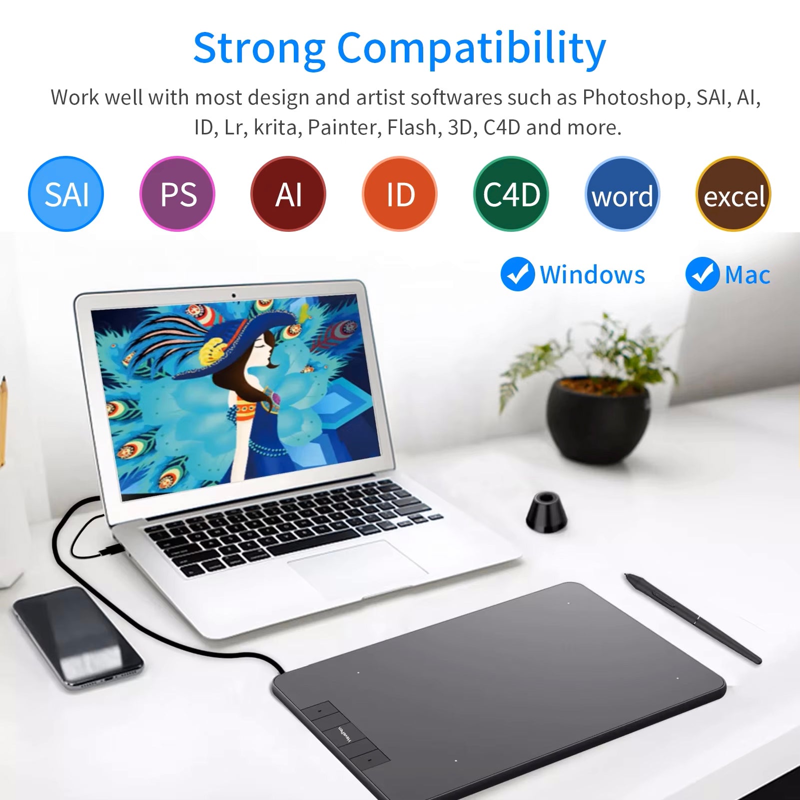Customized Press Keys:4 programmable keys for quick access to frequently used functions, boosting efficiency. ±60° Tilt Function:Enhances precision with ±60° tilt, offering natural lines for diverse brush types. YZ 640|Pen Tablet|OS Compatibility:Supports Android, Windows, and macOS, ensuring versatility for various creative environments. Large Work Area:6X4 inches drawing surface, ideal for detailed work and matching laptop screens. 8192 Levels Pressure Sensitivity:Highly sensitive with 8192 levels, providing accurate and smooth drawing experiences.